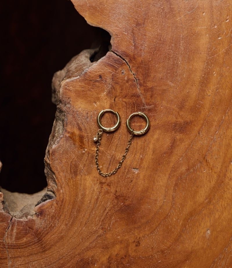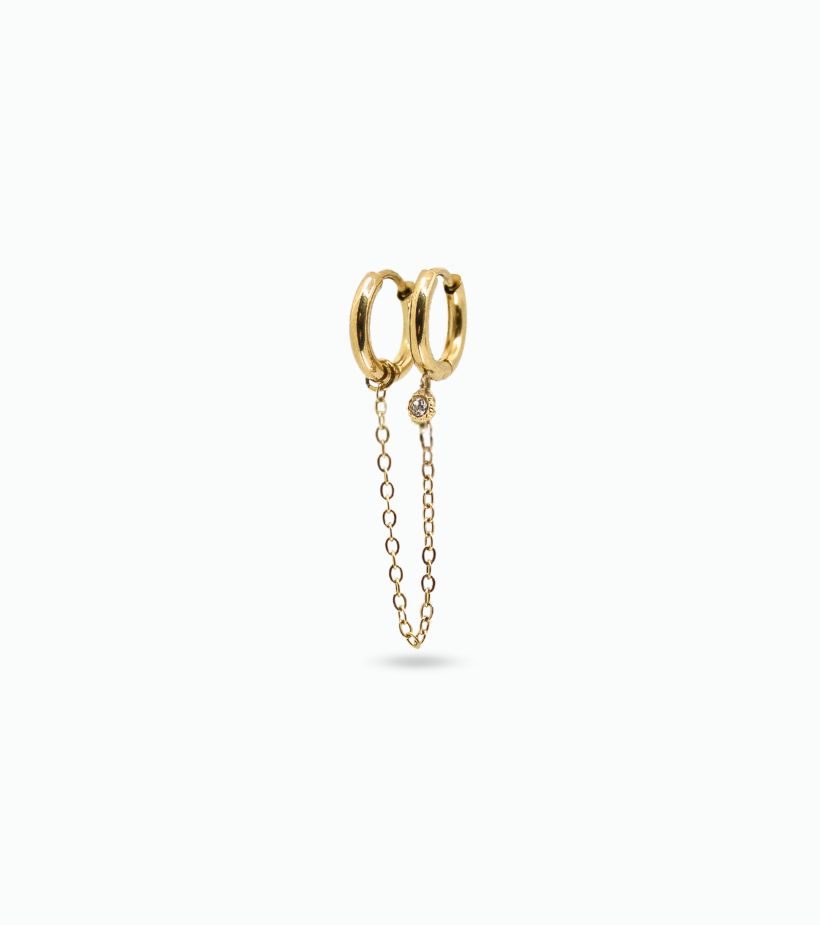 Mono boucle d’oreille double avec chaîne et strass en acier inoxydable doré à l’or fin. Créez votre composition d’oreille avec nos mono boucles en acier inoxydable ✨