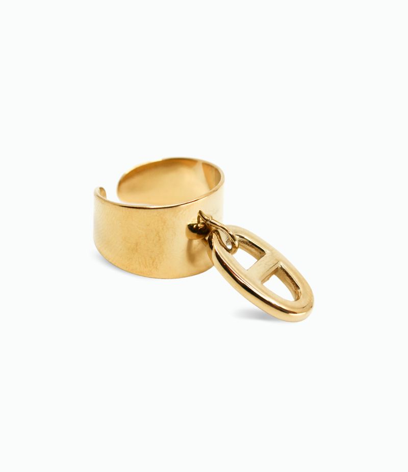 Notre bague Fabienne est en acier inoxydable doré. Elle est décorée d’un pendentif chaîne d’ancre.