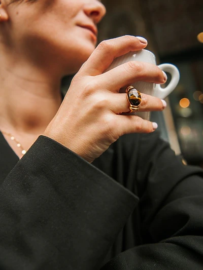 Notre bague Zoeline est faite d’acier inoxydable doré à l’or fin, ou d’acier inoxydable simple. Un design de chaîne gourmette habille son anneau central.