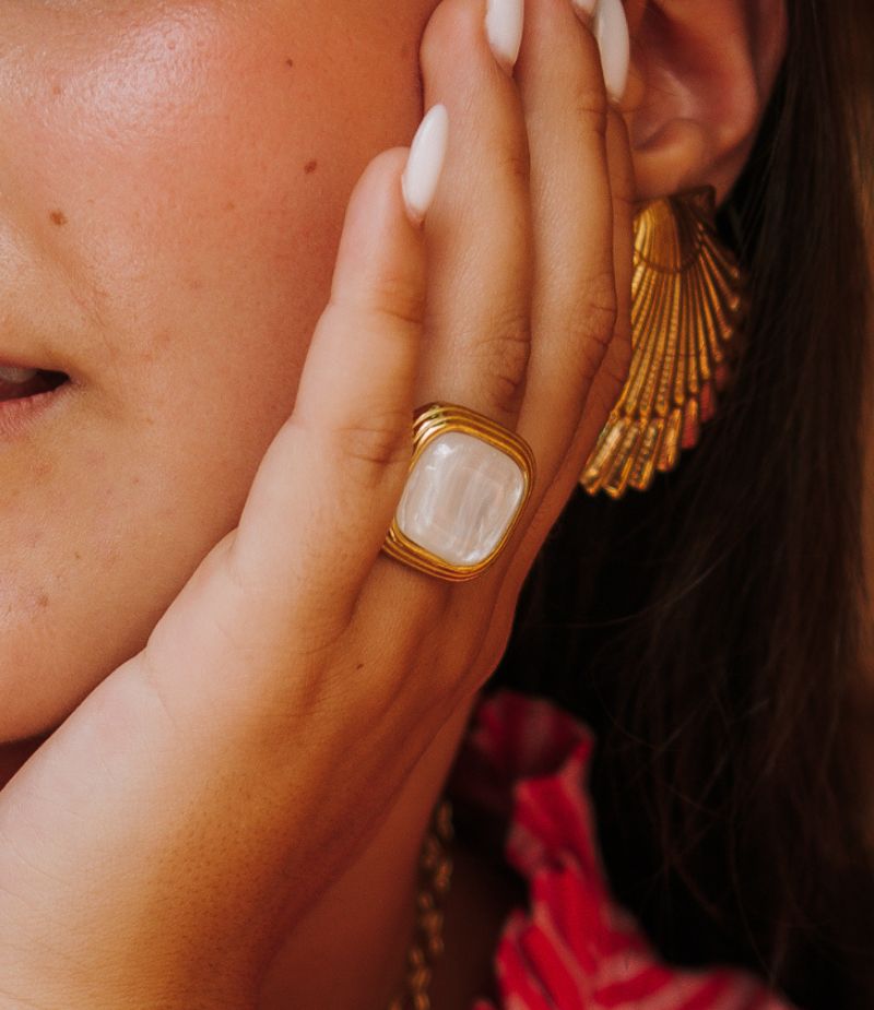 Notre bague Ora en acier inoxydable est sertie d’une pierre de Nacre 🦪