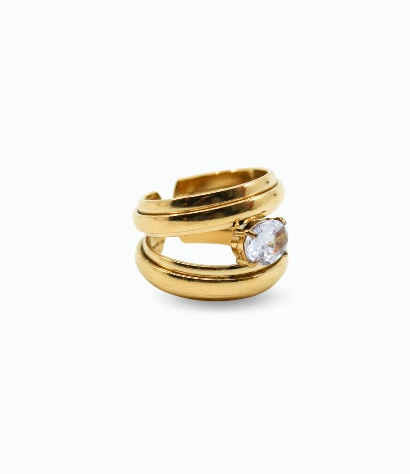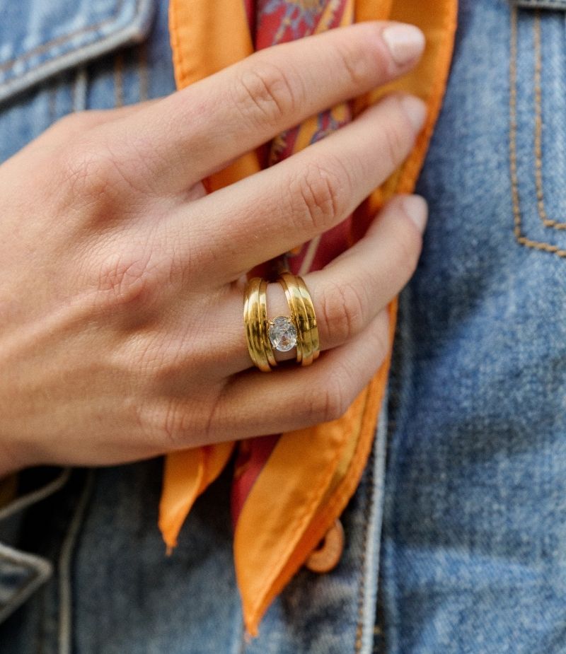 Bague en acier inoxydable doré à l’or fin. Le strass en oxydes de zirconium a une brillance semblable au diamant.