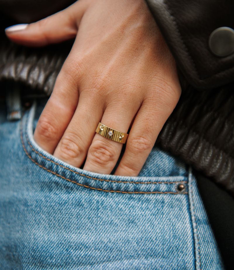 Notre bague Stella est en acier inoxydable doré à l’or fin, ou en acier simple. Son tour de doigt est bordé d’un strass et de petites étoiles ⭐