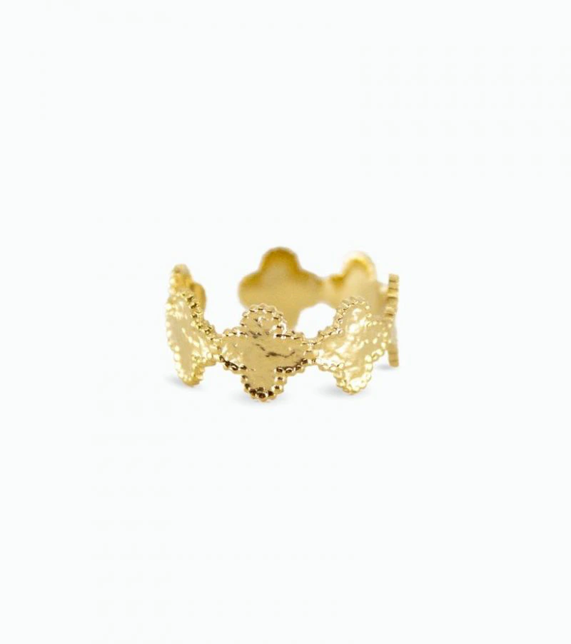 Notre bague Ophélie est faite d’acier inoxydable doré à l’or fin, ou d’acier simple. Son tour de doigt est composé de petits trèfles 🍀