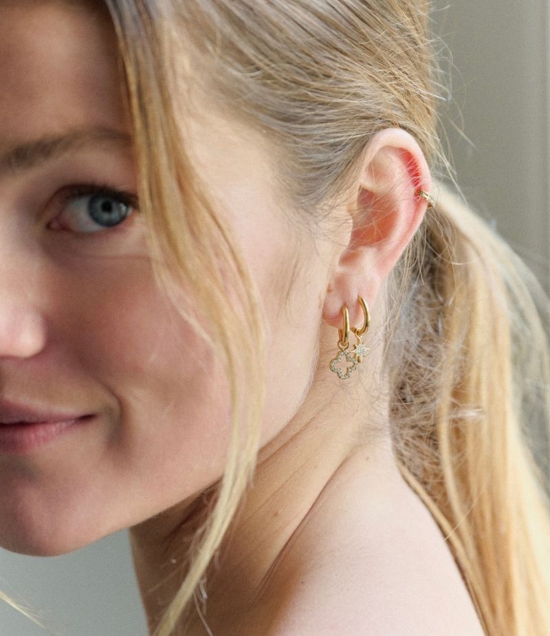 Nos mini créoles Ophélie en acier inoxydable doré à l’or fin sont bordées de pendentifs trèfles brillants🍀