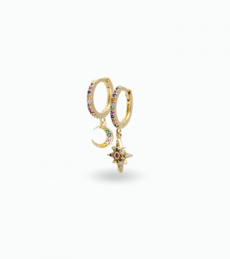 Mini créoles dépareillées plaquées or 18 carats et 3 microns avec pendentif lune et étoile.