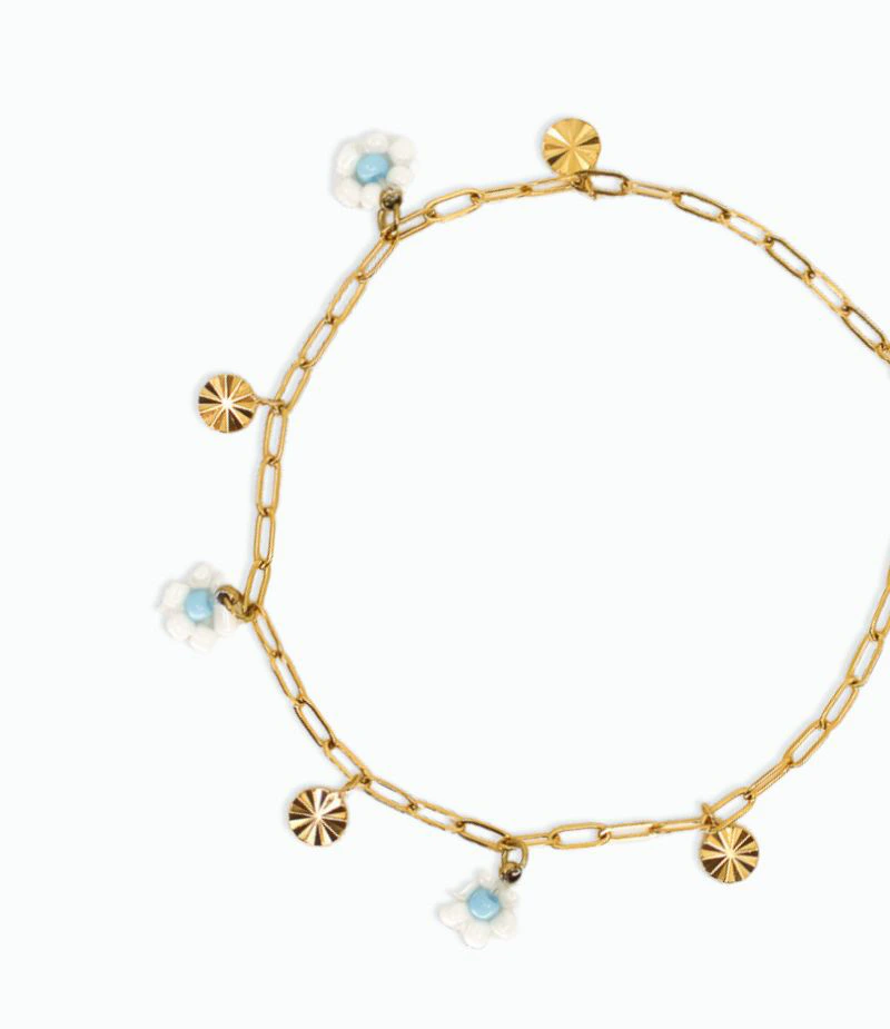Notre bracelet cheville en acier inoxydable doré à l’or fin ou en acier. Il est bordé de petites fleurs en perles blanches.
