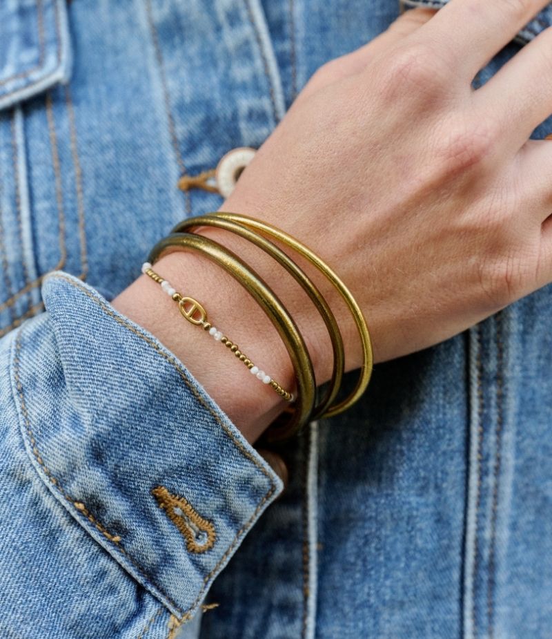 Des feuilles dorées remplissent l’intérieur des bracelets qui sont finis par des huiles. Dans la tradition tibétaine, les bracelets bouddhistes viennent des temples d’Asie, où ils sont bénis par des moines pour apporter chance et félicité à celui ou celle qui les portent. Il est dit de les porter par chiffres impairs afin de bénéficier de leur bonne fortune, alors portez-les par 3, 5 ou 7 !