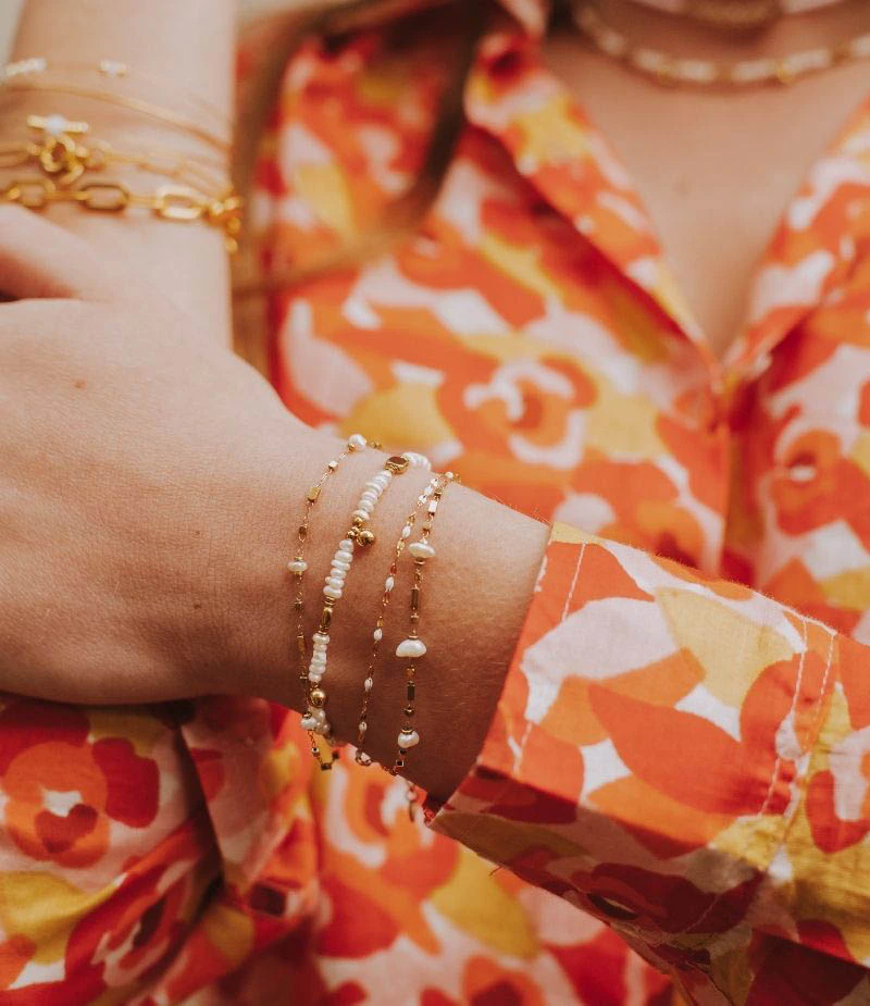 Notre bracelet Célestine est fait d’acier inoxydable doré à l’or fin. Son tour de poignet est bordé de jolies petites perles de Nacre.