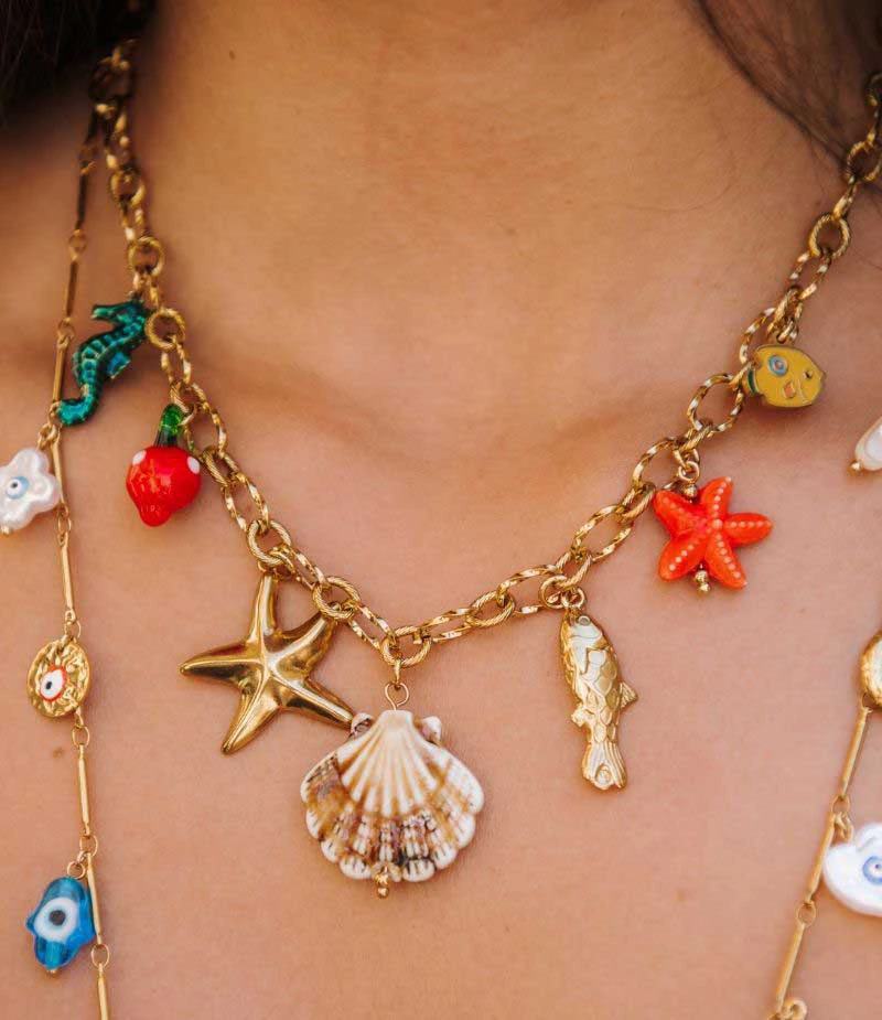 Notre collier Zéline en acier inoxydable est bordé de breloques colorées et dorées 🐟