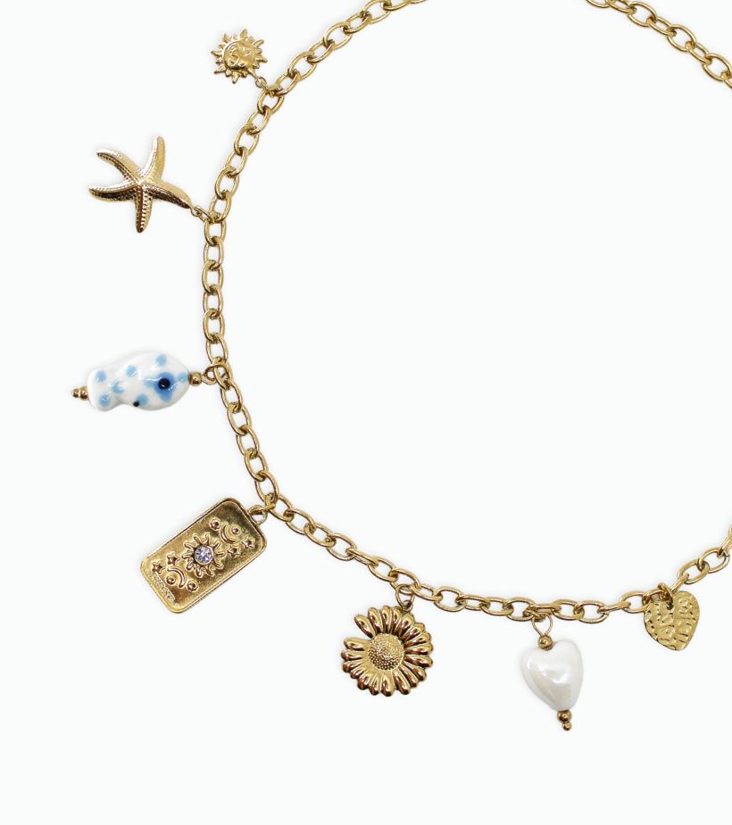 Notre collier Mila en acier inoxydable est décoré de petits pendentifs mobiles 🐟