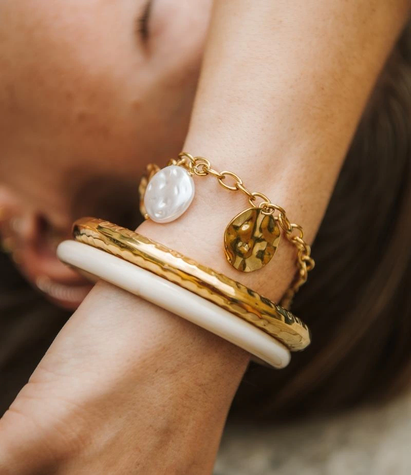 Notre bracelet Prisca en acier inoxydable est bordé de breloques pastilles dorées et nacrées 🦪