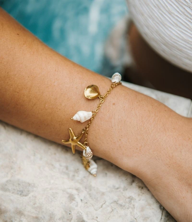 Notre bracelet Valentine en acier inoxydable est bordé de charms coquillages 🐚