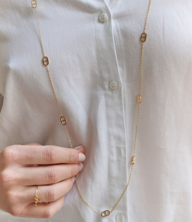 Sautoir long en acier inoxydable. Sa chaine est bordée de pendentifs chaine d’ancre ✨