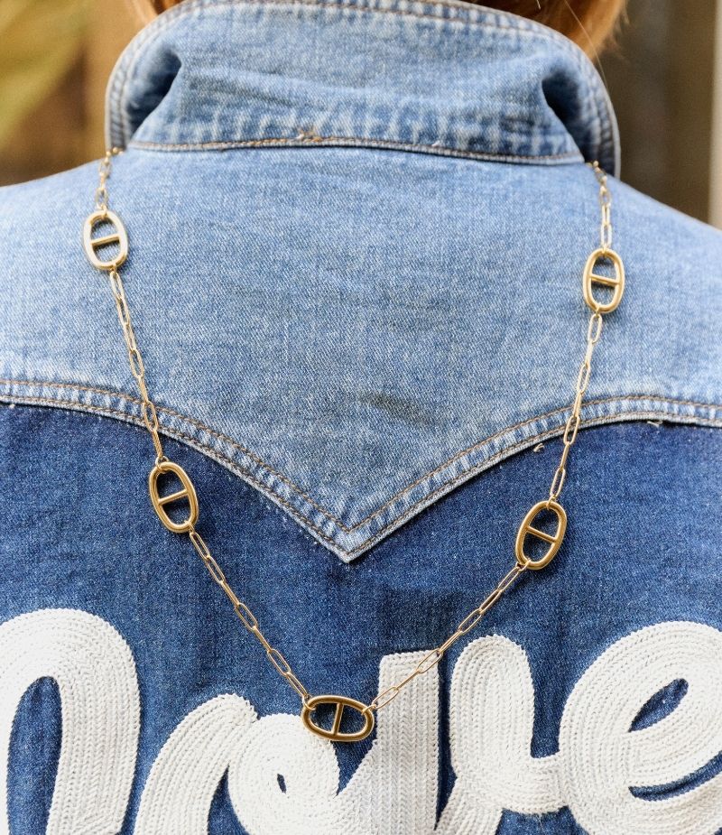 Collier sautoir en acier inoxydable. Sa chaine trombone est bordée de plusieurs pendentifs chaine d’ancre ⚓