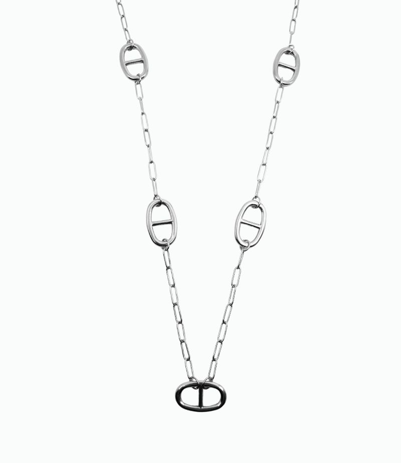Collier sautoir en acier inoxydable. Sa chaine trombone est bordée de plusieurs pendentifs chaine d’ancre ⚓