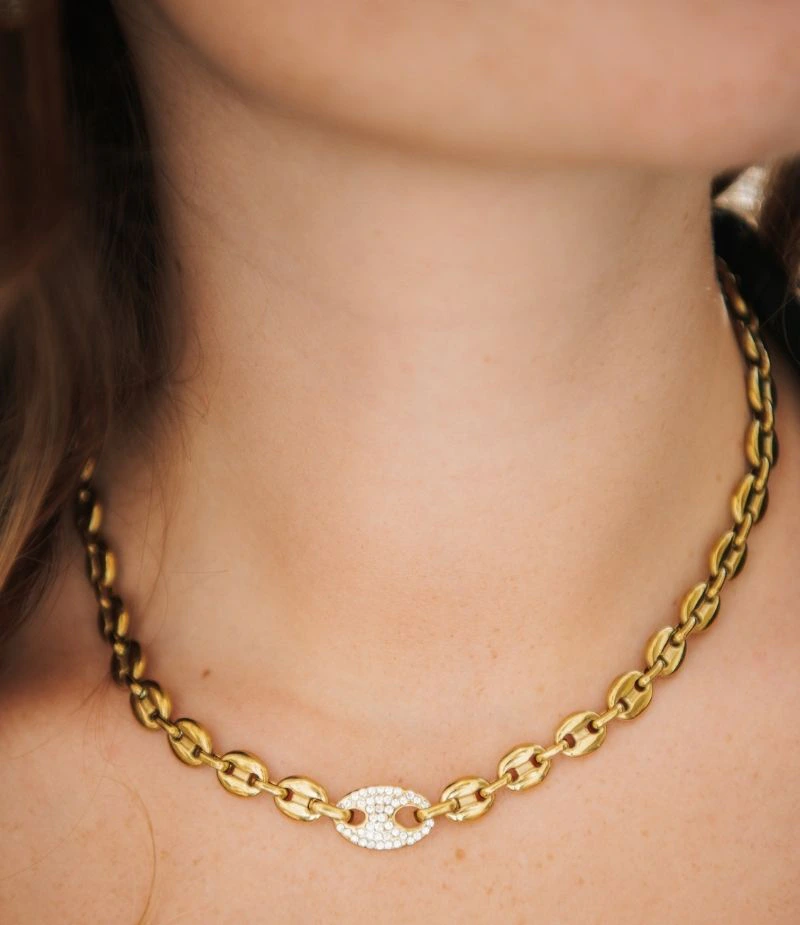 Notre collier Alma est fait d’une chaîne à maille grain de café avec un pendentif serti de strass ✨
