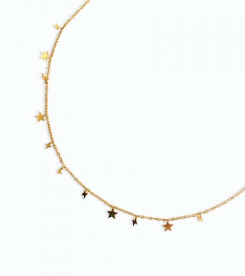 Notre collier Staria est en acier inoxydable doré à l’or fin ou en acier inoxydable simple. Il est bordé de petites lunes et étoiles.