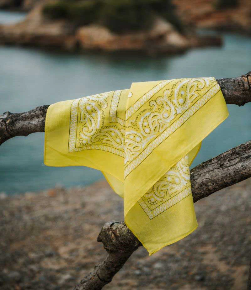 Foulard jaune à imprimé bandana qui sublimera vos looks. En tour de cou, aux poignets, dans les cheveux ou accroché à votre sac, ce petit accessoire est indispensable !