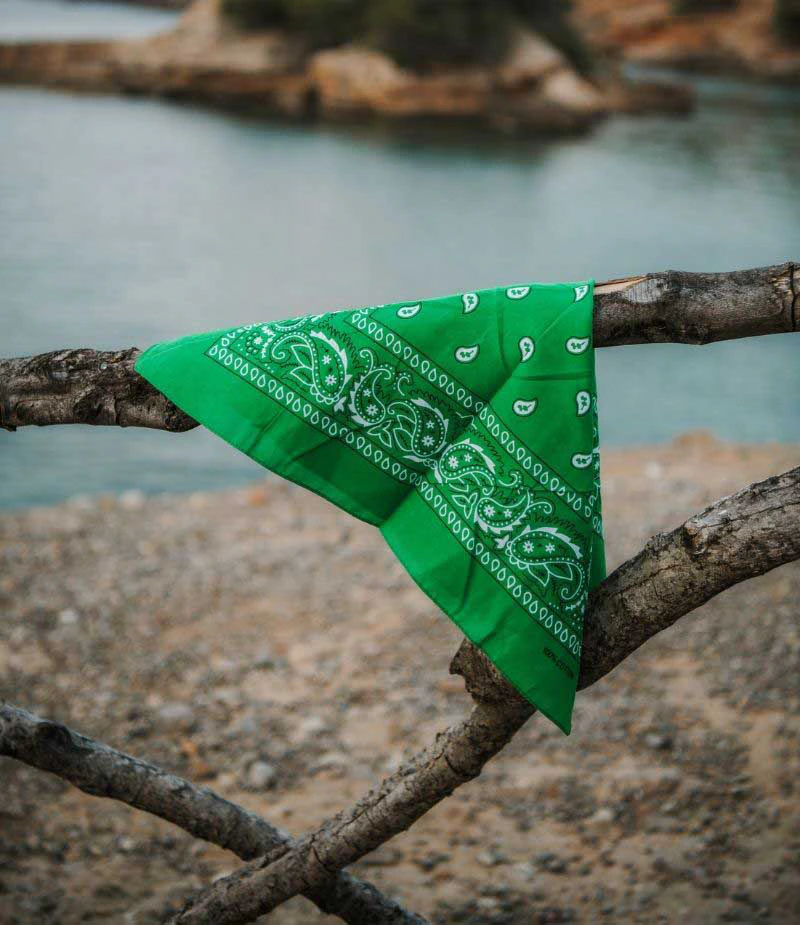Foulard vert à imprimé bandana qui sublimera vos looks. En tour de cou, aux poignets, dans les cheveux ou accroché à votre sac, ce petit accessoire est indispensable !