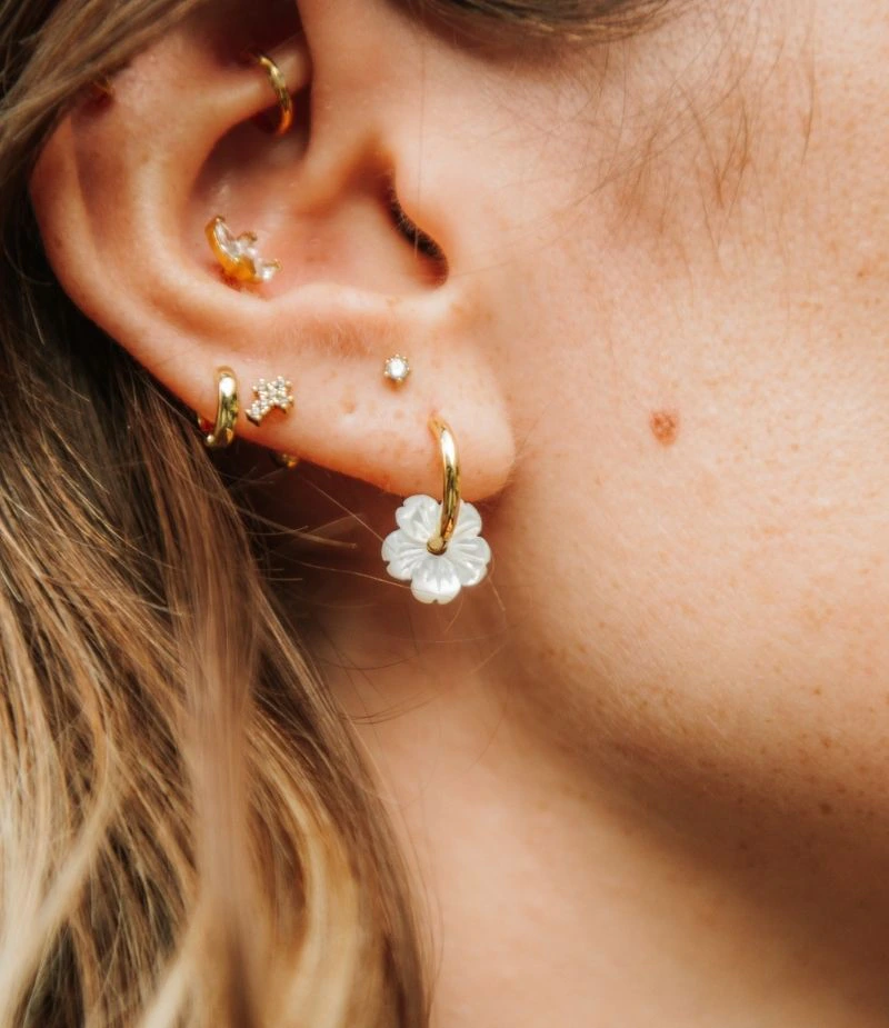 Mini créoles en acier inoxydable doré à l’or fin avec pendentif fleur en perles.