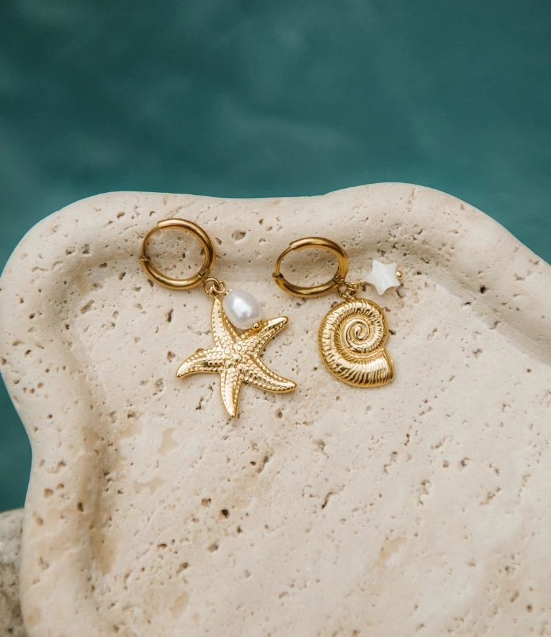 Nos mini créoles asymétriques Vaea en acier inoxydable sont serties de symboles aquatiques et de décorations à la finition nacrée 🦪