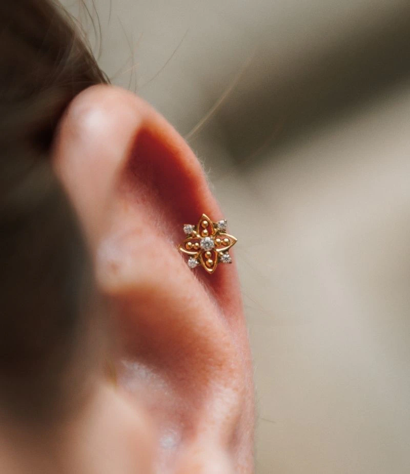 Notre piercing Carthame est en acier chirurgical doré à l’or fin. Idéal pour le lobe, l’hélix, l’anti-hélix, le rook et le tragus.