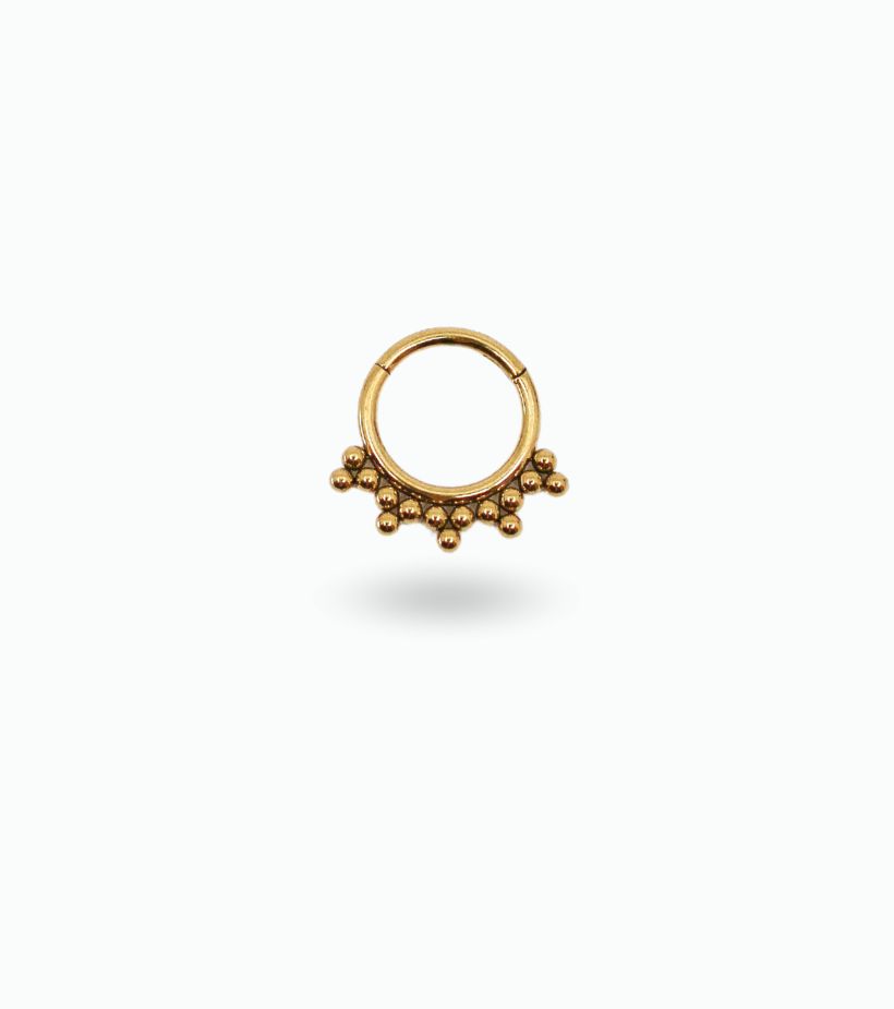 Notre piercing Flora est en acier chirurgical doré à l’or fin. Idéal pour le lobe, le daith et le conch.