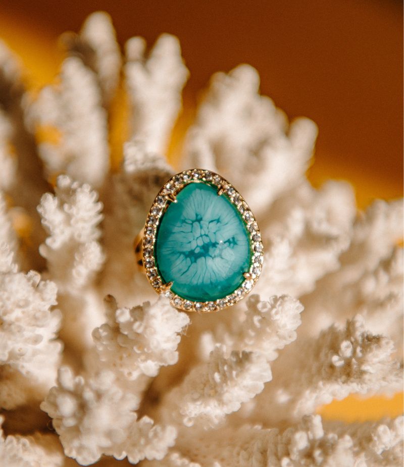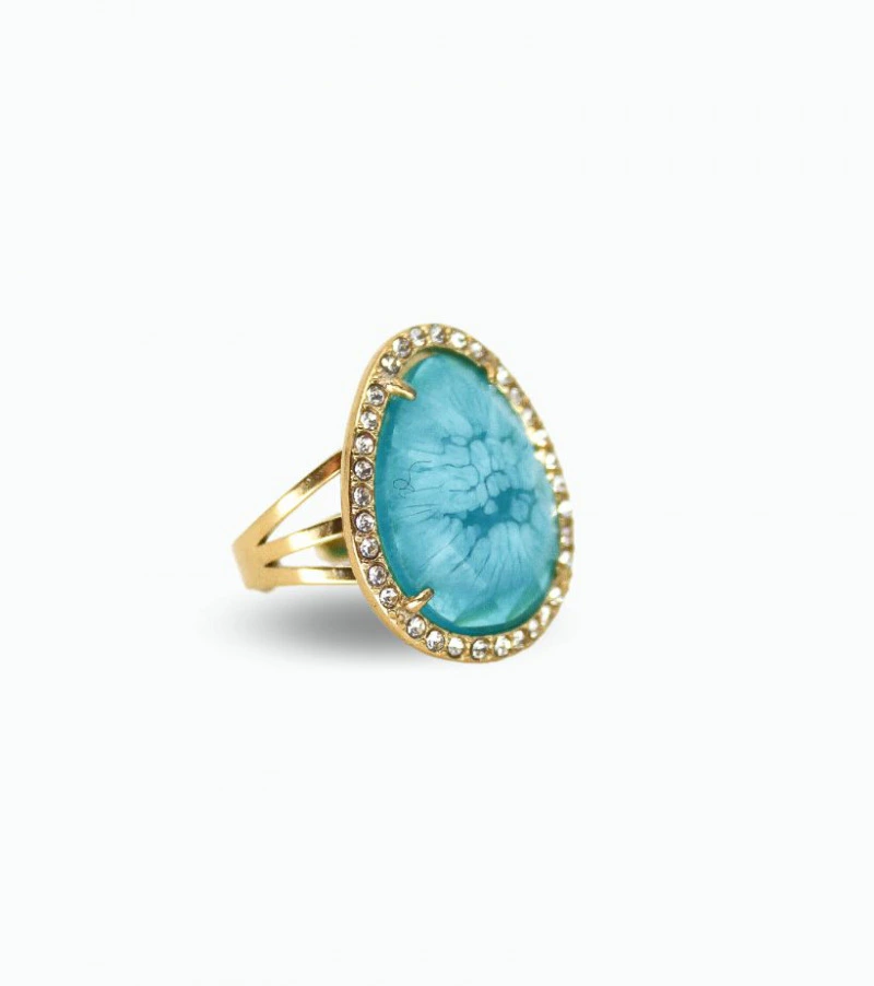 Bague en acier inoxydable doré à l’or fin sertie d’une pierre colorée bordée de strass ✨