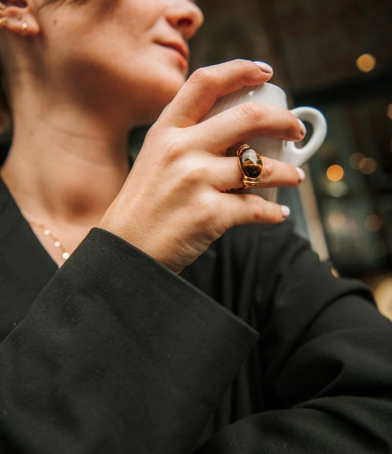 Notre bague Raphaëlle est faite en acier inoxydable doré à l’or fin. Son anneau est serti d’une pierre naturelle d’Œil de tigre.