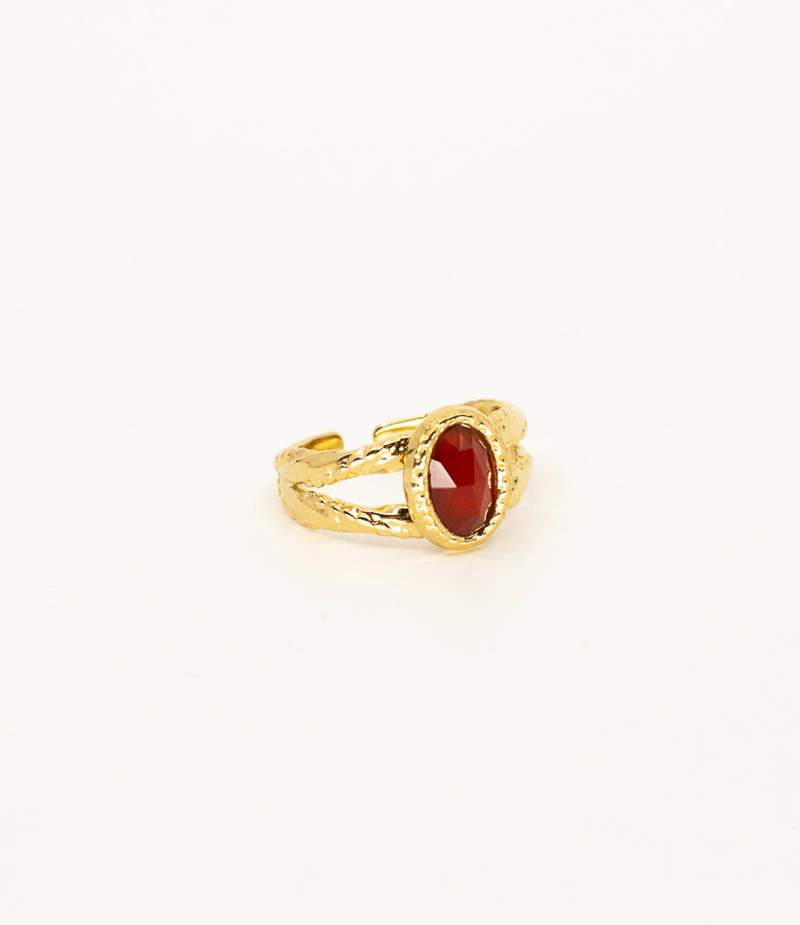 Notre bague Ondine est en acier inoxydable doré à l’or fin ou en acier. Son anneau épais est serti d’une pierre d’Agate rouge.