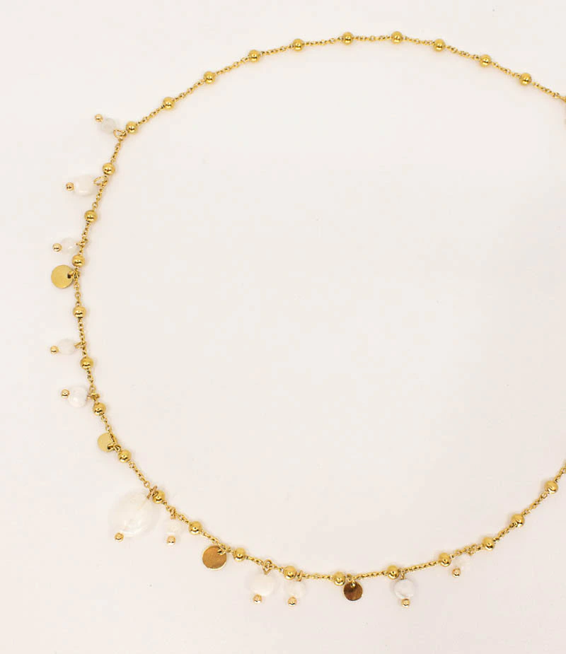 Collier en acier inoxydable doré à l’or fin bordé de pampilles en pierres naturelles de Pierre de Lune.