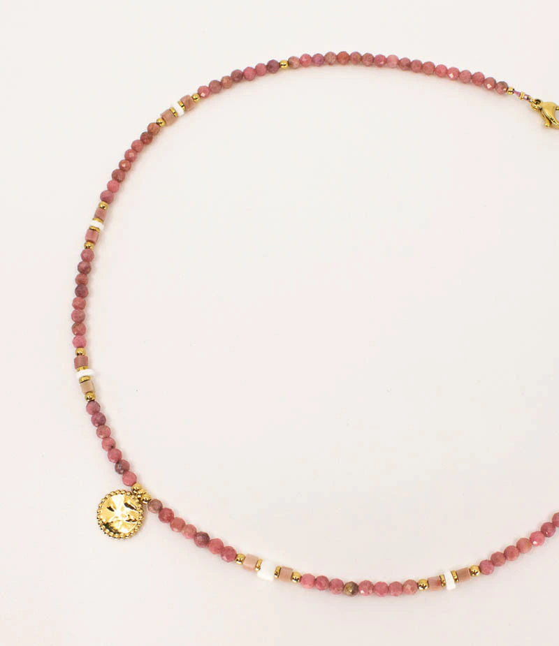 Notre collier Maéna est bordé de petites perles en pierres naturelles de Rhodonite, et présente un petit pendentif piécette martelée en acier inoxydable doré à l’or fin.