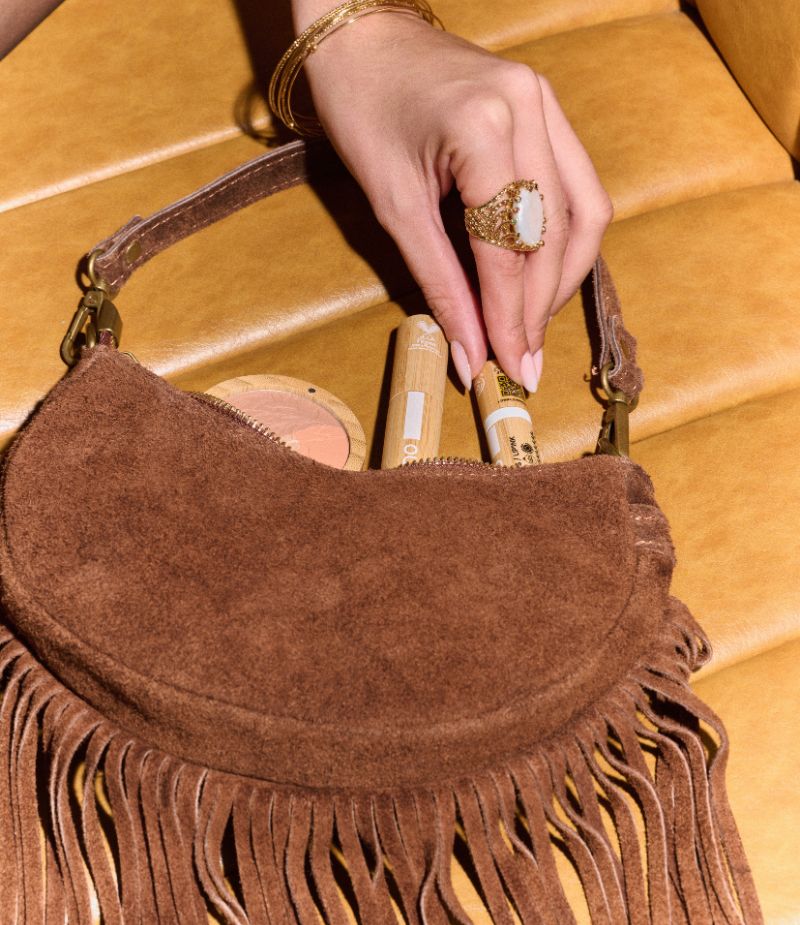 Sac à franges en cuir véritable et suède, pratique et tendance. Sa petite pochette zippée à l’intérieur permet de ranger vos essentiels en toute sécurité.